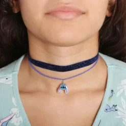 - Choker necklaces include one blue glitter fabric choker and one chain necklace with a colorful enamel-plated Stitch pendant . Both necklaces for girls measure 12 inches with a lobster claw closure and 3-inch extender