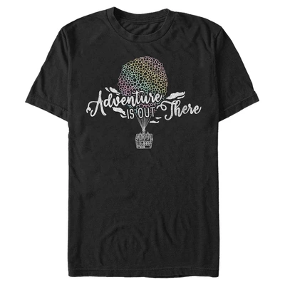 - Strut your stuff with this stylish new Men’s Graphic T-Shirt that is perfect for every occasion! Featuring Carl’s house tied to a bunch of colorful balloons with the quote “Adventure is out there” printed across the front.