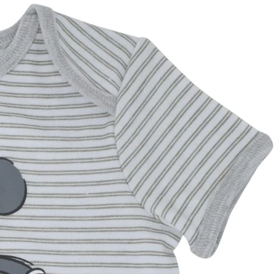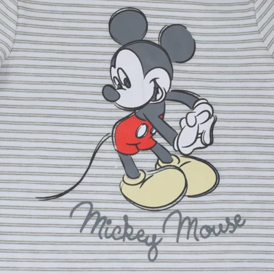 Dress your little one in this adorable Mickey Mouse outfit and get ready for a day filled with Disney magic. This 4-piece set features classic artwork of Mickey and includes a stylish gray and white striped bodysuit, gray pants, a matching striped bib, and a soft hat with 3D Mickey Mouse ears. Made from material that is soft on your baby’s skin, and with an easy-to-dress design, this cute Mickey Mouse set will keep your little one comfortable for all day play.