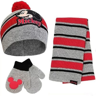 Matching Mickey Mouse pattern Winter Hat, Scarf, and Kids Glove set with thick earflaps, and features Mickey Mouse character patch embroidered on the front. Matching Kids Gloves features a Mickey Mouse gripper print design, Great coverage for the Head, Ears, and Neck, and Gloves for their cute little Hands.