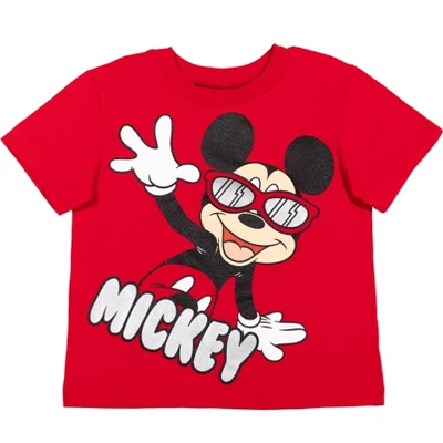 - Disney Mickey Mouse infant boys red and grey 4 piece mix n’ match outfit set including 2 short sleeve tee shirts and 2 pairs of shorts