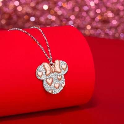 - Standout Style: Minnie’s famous silhouette is encrusted with brilliant pave cubic zirconias and topped by a pretty polished pink bow; pink heart accents complete the enchanting pendant