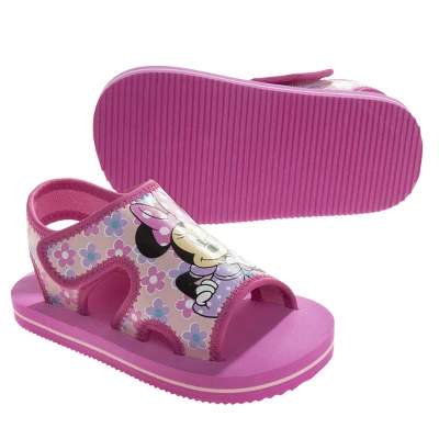 Disney Minnie Mouse hook and loop Toddler Girls Open Toe Sandals. These sandals are great for any and all activities and are very easy to take on and off. With hook-and-loop adjustability, they are also easy to custom fit to each and every foot.These sandals provide comfort and freshness, you can just slip on these kicks and be ready for the day.These Open-Toe Sandals offer kids extra freshness. These are a perfect match for the beach, pool, or any spring/summer assembly.