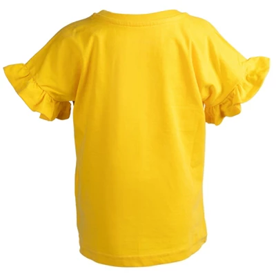 - Rib knit crew neck collar; Stylish ruffle sleeves; Amazing screen print art design featuring Simba and Nala making a heart with their tails and the title “The Lion King” underneath them on the yellow tee & Simba with the words “wild free & totally me” in script font and leopard print