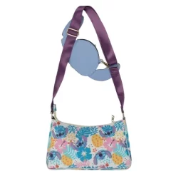 - CUSTOM DESIGN: All over print of Stitch’s face, pineapples, flowers, and palm leaves decorates this hand bag while the coin purse is designed to look like Stitch’s head, complete with a pair of 3D ears. Stitch fans will love this fun design.