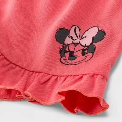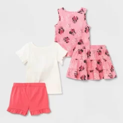Your toddler will love dressing up like their favorite mouse with this Four-Piece Minnie Mouse Top and Bottom Set. This four-piece outfit set includes two different sets. The first features a pink sleeveless top with a knotted front and a pink skirt, both featuring Minnie’s face, white dots and the text, “Doing my own things”. The other set includes a short-sleeve white top with ruffled sleeves and pink shorts with a ruffled hem, both featuring images of Minnie for adorable flair. All the pieces in this Minnie Mouse clothing set are made from a soft cotton blend for comfy wear, and they can be worn together or mixed and matched with other separates.