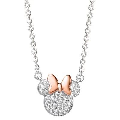 Shine bright with this Minnie Mouse pendant necklace! The pendant features the iconic Minnie Mouse silhouette adorned with sparkling cubic zirconia stones, adding a touch of glamour to your style. Made with a silver plated finish, this necklace includes a 16-inch chain with a 2-inch extender for a customizable fit. It’s a perfect accessory for Disney and Minnie Mouse fans who appreciate fine craftsmanship and timeless style. The necklace comes in an authentic Disney gift box, making it a perfect gift for birthdays, holidays, or any special occasion