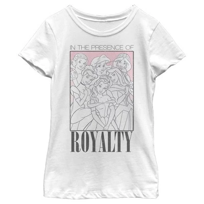 - Strut your stuff with this stylish new girls’ t-shirt that is perfect for every occasion! Featuring a black and white graphic of Ariel, Snow White, Jasmine, Cinderella, Belle, Aurora, and Jasmine with the phrase: “In the Presence of Royalty” printed across the front.