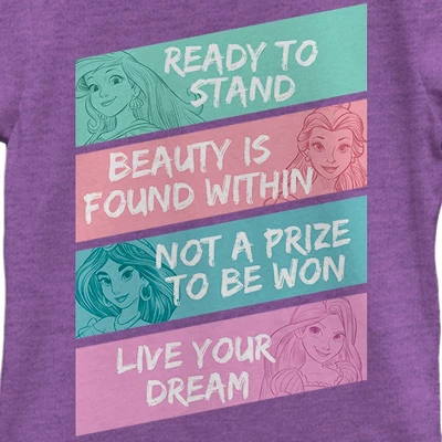 - Strut your stuff with this stylish new girls’ t-shirt that is perfect for every occasion! Featuring Ariel, Belle, Jasmine, and Rapunzel alongside inspiring phrases like “Ready to Stand”, “Live Your Dream”, and more.