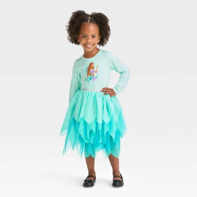 Dress up your little one for parties or any other occasion in sweet, twirl-worthy style with this Disney Princess Little Mermaid Tutu Dress. This mint green long-sleeve tutu dress features a colorful print of Little Mermaid characters on the bodice, and the layered tulle skirt with a sparkly elastic waistband provides flouncy movement and shine. The lightweight fabric with a hint of spandex offers comfy all-day wear, while the pullover scoop neck allows for fuss-free dressing. Have them wear this dress alone with sparkly shoes, or layer up with tights and a cardigan to keep them warm in cooler weather.