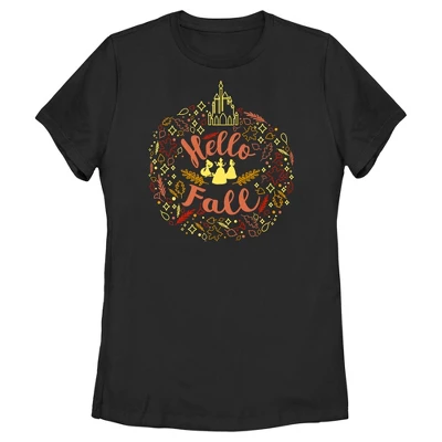 - Strut your stuff with this stylish new women’s t-shirt that is perfect for the fall season! Featuring silhouettes of Rapunzel, Cinderella, and Belle in yellow, surrounded by fall icons along with the phrase: “Hello Fall” in orange lettering across the front.
