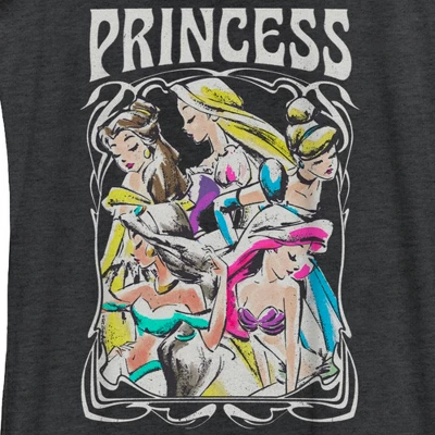 - Strut your stuff with this stylish new women’s racerback tank top that is perfect for every occasion! Featuring Belle, Rapunzel, Cinderella, Jasmine, and Ariel in colorful watercolor print and the word “Princess” above.